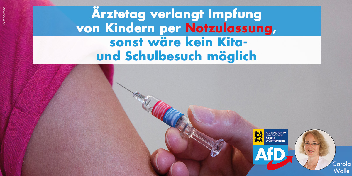 Es herrscht weder eine Notsituation, die das eilige Vorgehen der Impfstoffe für Kinder rechtfertigen könnte, noch die Datenlage, die schnelles Handeln erfordert, befindet Wolle. „Laut einer Stellungnahme der Deutschen Gesellschaft für Pädiatrische Infektiologie (DGPI) sowie der Deutschen Gesellschaft für Krankenhaushygiene (DGKH) sind seit Beginn der Pandemie von schätzungsweise 14 Millionen Kindern und Jugendlichen in Deutschland etwa 1200 mit einer Sars-CoV-2-Infektion im Krankenhaus behandelt worden. Angesichts der Tatsache, dass der Impfstoff eine Notzulassung bekommen soll und seine bekannten und noch unbekannten Nebenwirkungen nicht ausreichend erforscht sind, erscheint mir diese Forderung als unverhältnismäßig. Auch die Kritiker beurteilen die Risiko-Nutzen-Abwägung als negativ. Der Ärztetag ignoriert nicht nur die Kritik, er geht noch viel weiter. Der Deutsche Ärztetag maßt sich an zu empfehlen, wann den Kindern das Grundrecht auf Bildung gewährt oder verwehrt werden darf. Das ist unerhört.“