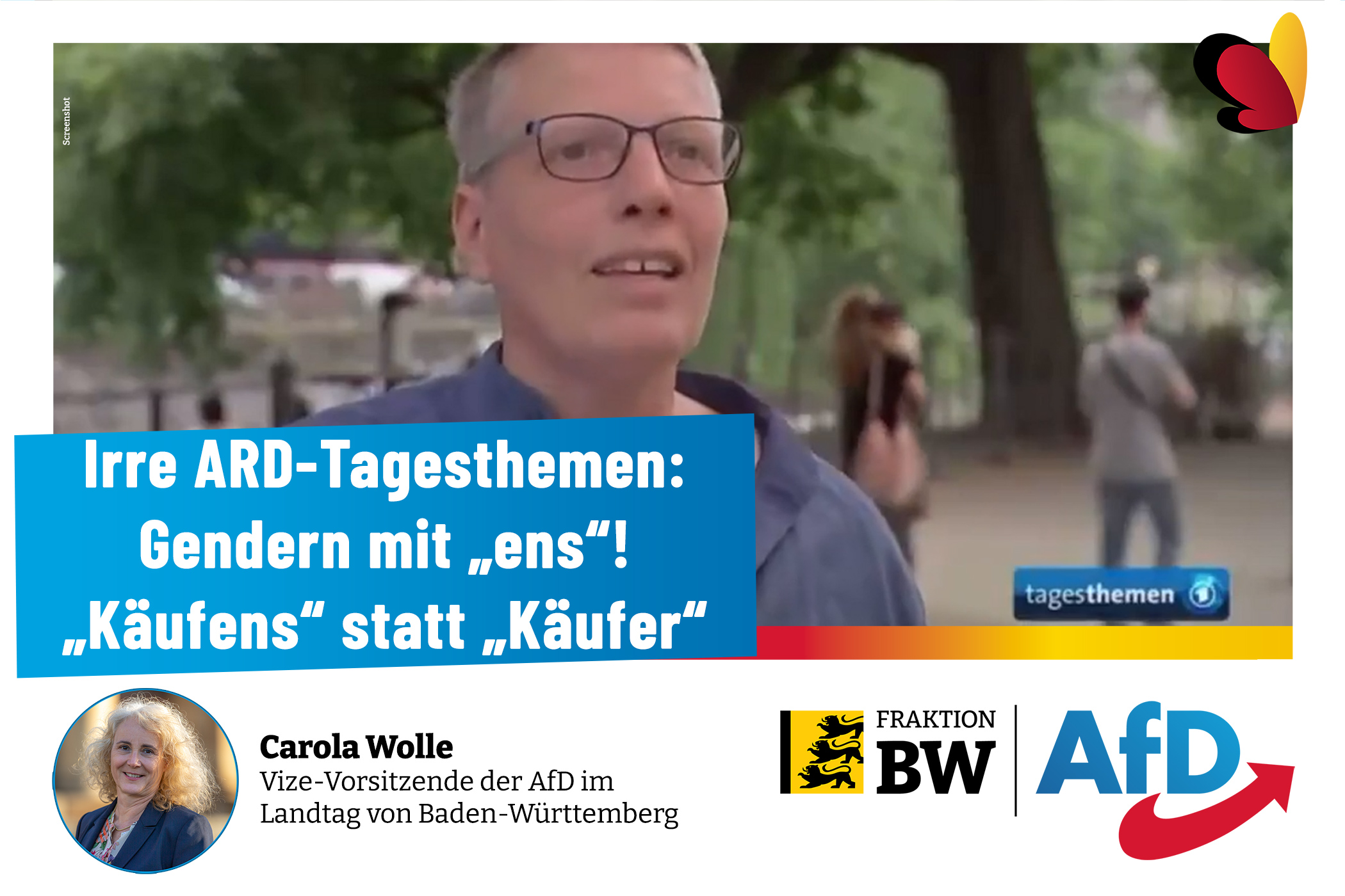Die gleichstellungspolitische Fraktionssprecherin Carola Wolle hat angesichts neuer absurder Vorschläge zur Gendersprache ein sofortiges Ende aller elitären Sprachverordnungen gefordert. „Die emeritierte Gender-Studies-Professor Lann Hornscheidt, die nun als ‚Profex Drex‘ firmiert, durfte in den ARD-Tagesthemen tatsächlich ihre skurrile Forderung erheben, die Endung ‚ens‘, den Mittelteil von ‚Mensch‘, für alle stehen zu lassen. Anstatt ‚Ein Käufer und sein Einkaufskorb‘, solle man lieber ‚ens Käufens und ens Einkaufskorb‘ sagen. Das sei, so Hornscheidt, eine ‚neue Form‘ des Sprechens, die ‚die Gesellschaft zusammenführt‘. Das ist kein Witz. Ich bin fassungslos, dass solcher zwangsgebührenfinanzierte Unsinn unwidersprochen gesendet werden durfte.“