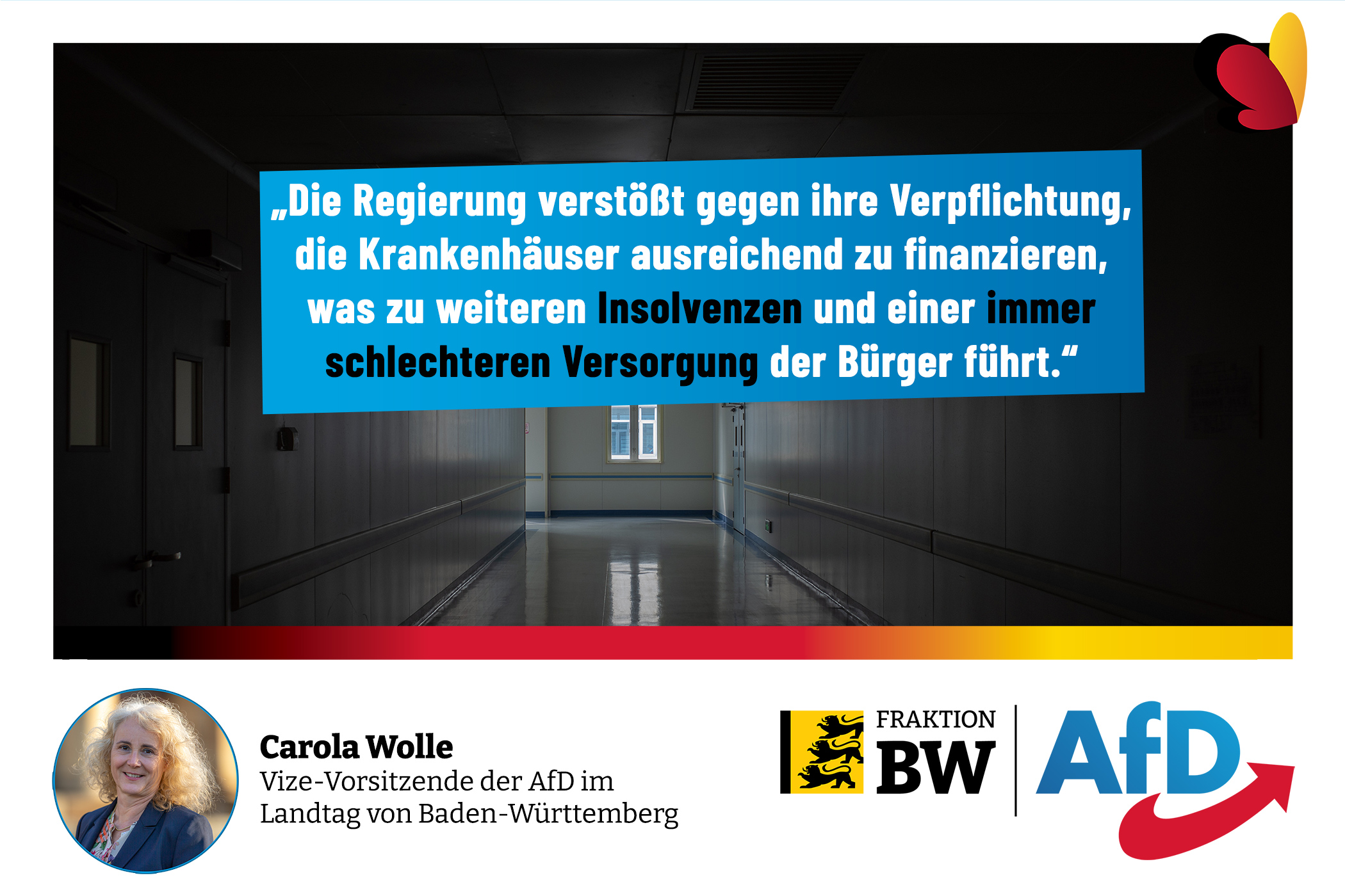Die sozialpolitische AfD-Fraktionssprecherin Carola Wolle hat die Aussagen des jüngsten Krankenhaus Rating Reports als Ohrfeige für die Gesundheitspolitik der Landesregierung gewertet. „Bereits 2019 schrieben 13% aller deutschen Krankenhäuser tiefrote Zahlen; nach der Prognose der Autoren aus dem RWI (Leibniz-Institut für Wirtschaftsforschung) für 2022 könnte sich die Lage jedoch deutlich verschlechtern. Noch beschämender ist die Feststellung des Reports, dass das Krankenhaus-Rating ausgerechnet in Baden-Württemberg am schlechtesten ausfällt. Mit einem BIP von 500 Mrd. € steht unser Land im Deutschland-Vergleich auf Platz drei, bei den Gesundheitsausgaben dagegen auf einem wirklich peinlichen vorletzten Rang (2018: € 4.503/Kopf).“