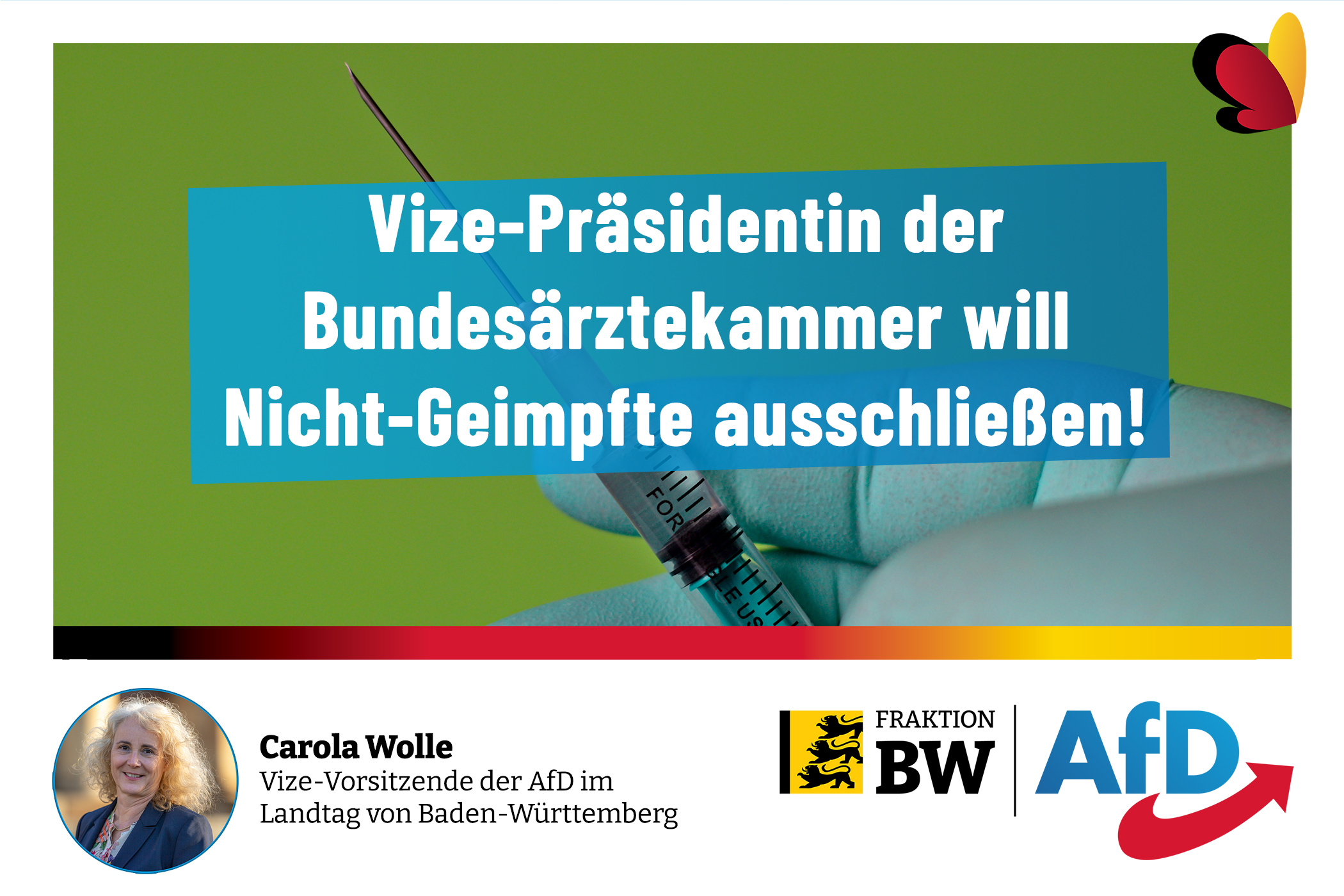 Die sozialpolitische AfD-Fraktionssprecherin Carola Wolle hat der Vize-Präsidentin der Bundesärztekammer, Ellen Lundershausen, völligen Realitätsverlust vorgeworfen. „Sie hält einen Ausschluss von nicht gegen Covid-19 geimpften Erwachsenen etwa von Kino- oder Restaurantbesuchen für gerechtfertigt – in deren eigenem Interesse: diese müssten davor geschützt werden, ‚sich mit einer für sie lebensbedrohlichen Krankheit anzustecken oder selbst andere anzustecken‘. Abgesehen davon, dass sie damit erneut die Nichtexistenz der Kategorie ‚Gesunde‘ bekräftigt – damit bestätigt Lundershausen, dass Geimpfte die gleiche Gefahr darstellen wie Ungeimpfte. Also wozu das ganze Theater?“
