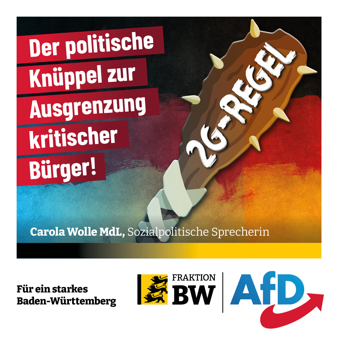 Wer sich hierzulande nicht impfen lassen will oder aus gesundheitlichen Gründen nicht impfen kann, wird zum Fremdkörper in seiner eigenen Heimat, erkennt die Fraktionsvize. „Im Rausch der Macht und im Glauben an ihre Allwissenheit erklärt die Landesregierung und der Grüne Gesundheitsminister Lucha Nichtgeimpfte zu Feinden der Volksgesundheit. Die Regierung in Bund und Land sät Zwietracht und Angst und spaltet so die Bevölkerung. Trotz dokumentierter Impfdurchbrüche werden die Menschen im Ländle zur Impfung getrieben! Die 2G-Regel ist daher kein Mittel der Corona-Bekämpfung. Die 2G-Regel ist der politische Knüppel zur Ausgrenzung kritischer Bürger.“