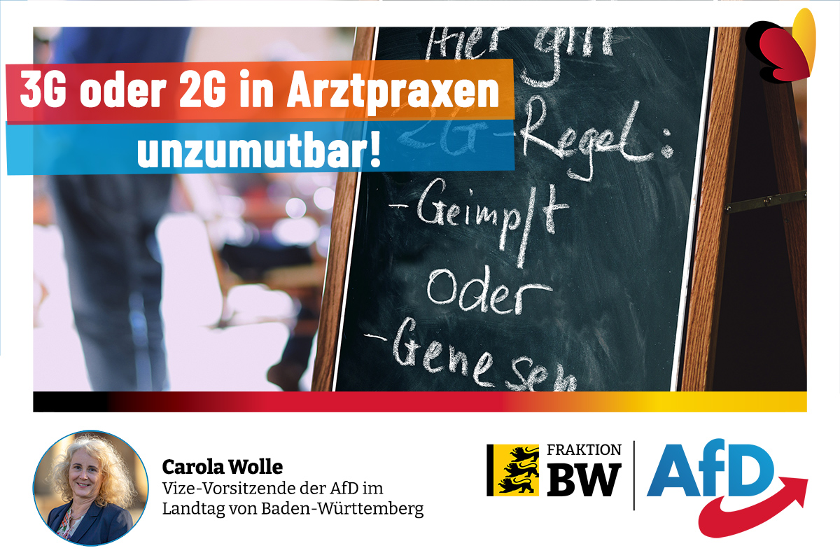 „In was für einer Zeit leben wir eigentlich, da Ärzte Ärzte dazu anstiften, ihr Ärztliches Ethos in den Wind zu schießen und ihre Praxen nur nach der 3G-Regel zu führen?“ Mit diesen Worten empört sich die sozialpolitische AfD-Fraktionssprecherin Carola Wolle über eine entsprechende Forderung des Vorstands von Medi Baden-Württemberg an die Politik, über die die Ärztezeitung berichtet.