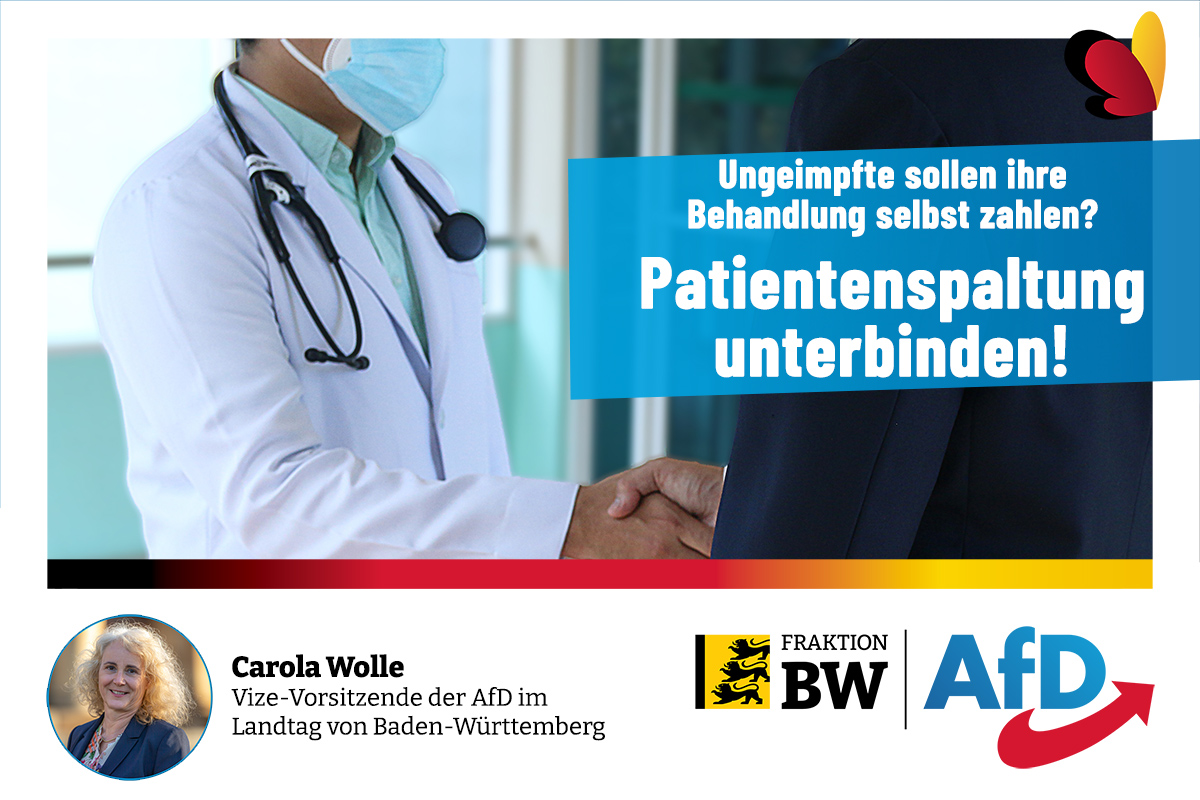 Die sozialpolitische AfD-Fraktionssprecherin Carola Wolle hat sich entsetzt über die Forderung der Kassenärztliche Vereinigung Berlins gezeigt, dass ungeimpfte Bürger für ihre Behandlung künftig bezahlen sollen. „Wer die Forderung der KV Baden-Württemberg für nicht steigerungsfähig hielt, Ungeimpfte und Nichtgetestete schlechter zu behandeln und ihre Behandlungszeiten zu reduzieren, wird jetzt eines Besseren belehrt. Patienten sollten über eine Eigenbeteiligung oder über einen Aufschlag auf den Kassenbeitrag zur Kasse gebeten werden, heißt es aus Berlin. Welche Patientenspaltung folgt als nächstes? Dann erwarte ich als Nichtraucherin, dass künftig auch Raucher ihre Behandlung selbst zahlen und meine Beiträge nicht dafür verschwendet werden.“