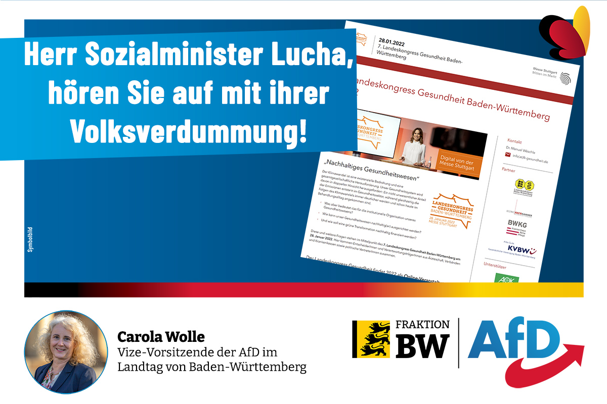 Was Lucha mit „gesundheitlicher Chancengleichheit“ meint, die „durch drohende Folgen des Klimawandels immer wichtiger“ werde, weiß nur er allein, ergänzt die sozialpolitische Fraktionssprecherin Carola Wolle. „Klaus Hurrelmann arbeitete heraus, dass vor allem die Verbreitung von psychisch und sozial mit beeinflussten Gesundheitsstörungen bei Kindern und Jugendlichen zugenommen habe. Die sind aber nicht aufs Klima zurückführen, sondern auf die unzureichende Verarbeitung und Bewältigung der Entwicklungsaufgaben: Beeinträchtigungen des Immunsystems, Mangel an körperlicher Aktivität, falsche Ernährung, Übergewicht, mangelnde Bewältigung von psychischen und sozialen Herausforderungen, depressive und aggressive Stimmungsschwankungen und der Konsum von psychoaktiven Substanzen. Und all das haben Sie mit Ihrer nunmehr fast zwei Jahre währenden tyrannischen Corona-Politik mitzuverantworten! Der Show-Kongress war nichts weiter als ein grandioser Ablenkungsversuch vom eigenen Totalversagen. In dieser Situation die Frage aufwerfen zu lassen, ob uns unsere Kinder eher gestiegene Benzinpreise oder gestiegene Meeresspiegel vorwerfen werden, ist einfach nur obszön!“