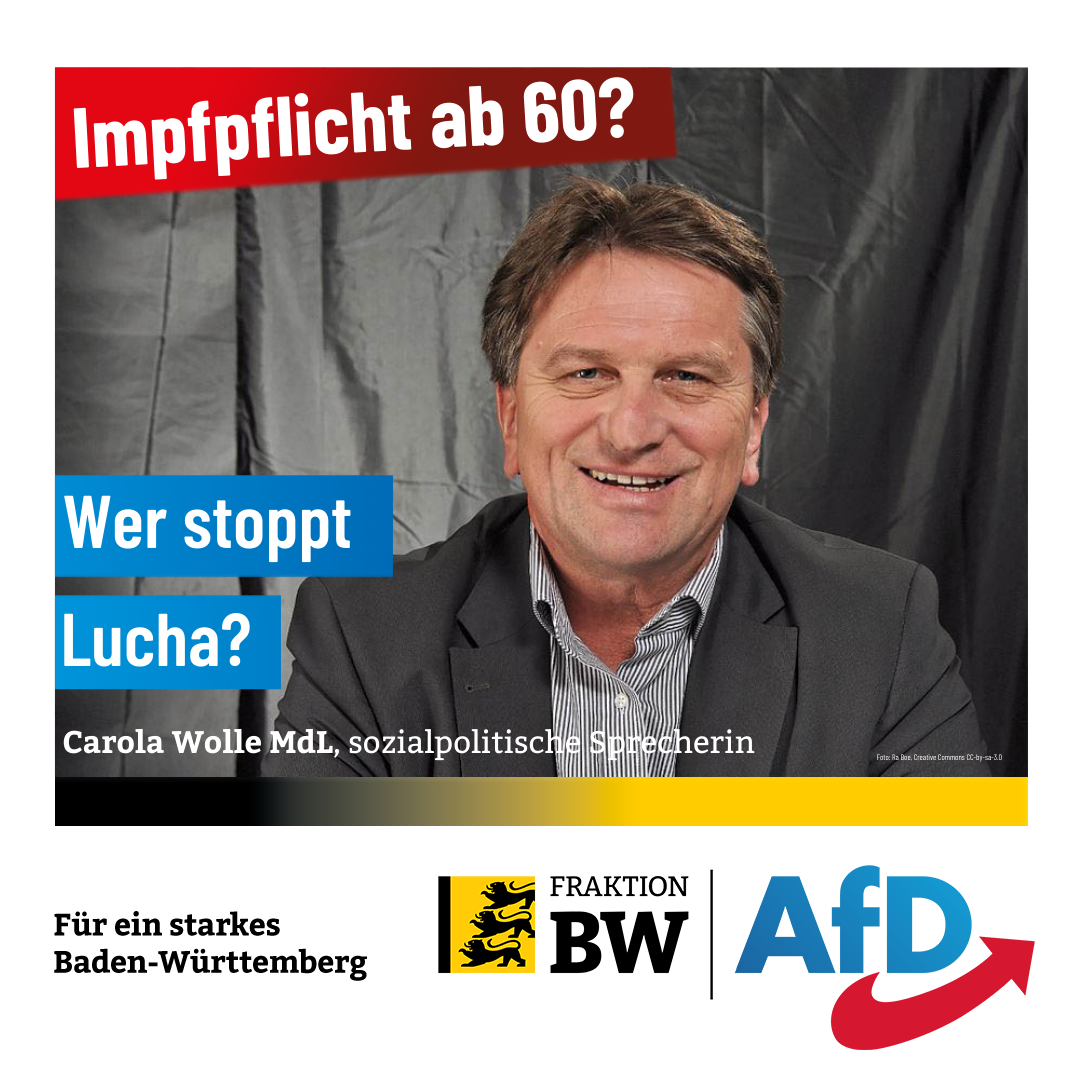 Die sozialpolitische AfD-Fraktionssprecherin Carola Wolle hat Sozialminister Manfred Lucha (Grüne) vollständigen Realitätsverlust vorgeworfen. „Bei der digitalen Gesundheitsministerkonferenz stellten er und sein hessischer Amtskollege tatsächlich den Antrag auf einen Neuanlauf im Bundestag für eine Impfpflicht ab 60 Jahren. Das ist kein Witz. Erst in diesem Monat ergab die Online-Expertenanhörung zur Corona-Impfpolitik, dass die Corona-Impfnarrative unhaltbar sind. Die Pathogenität einer neuen Variante sei nicht vorhersehbar, hieß es; und der Impfschutz mit den eingesetzten Impfstoffen sei bei einer neuen Variante gering. Doch Lucha setzt unbeirrt seine Reise in der Parallelwelt fort.“