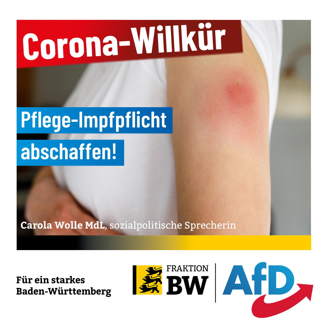 32.000 ungeimpfte Beschäftigte gab es Ende März. Ihr Schicksal ist ungewiss, gewiss ist jedoch der kommende Krach des Pflegesektors, warnte Wolle. „Völlig ohne Not wird hier ein Pflegenotstand provoziert. Der Pflegesektor ist schon jetzt völlig unterbesetzt, unterbezahlt und überlastet. Statt ihn zu subventionieren und ihn so endlich zu stabilisieren, kommt Lucha mit weiteren Zwangsmaßnahmen um die Ecke. Diese werden dem Pflegesektor kurzfristig, aber auch künftig nur noch mehr schaden. Ich frage mich nämlich, wer unter solchen Arbeitsbedingungen noch arbeiten möchte. Jetzt bringt die Impfpflicht eine weitere Ungleichbehandlung mit sich. Dem müssen wir endlich ein Ende setzen. Landkreistagspräsident Walter (CDU) ist schon auf der richtigen Spur, wenn er nun eine Aussetzung der Pflege-Impfpflicht fordert. Diese Impfpflicht gehört aber nicht ausgesetzt, sondern endgültig abgeschafft!“