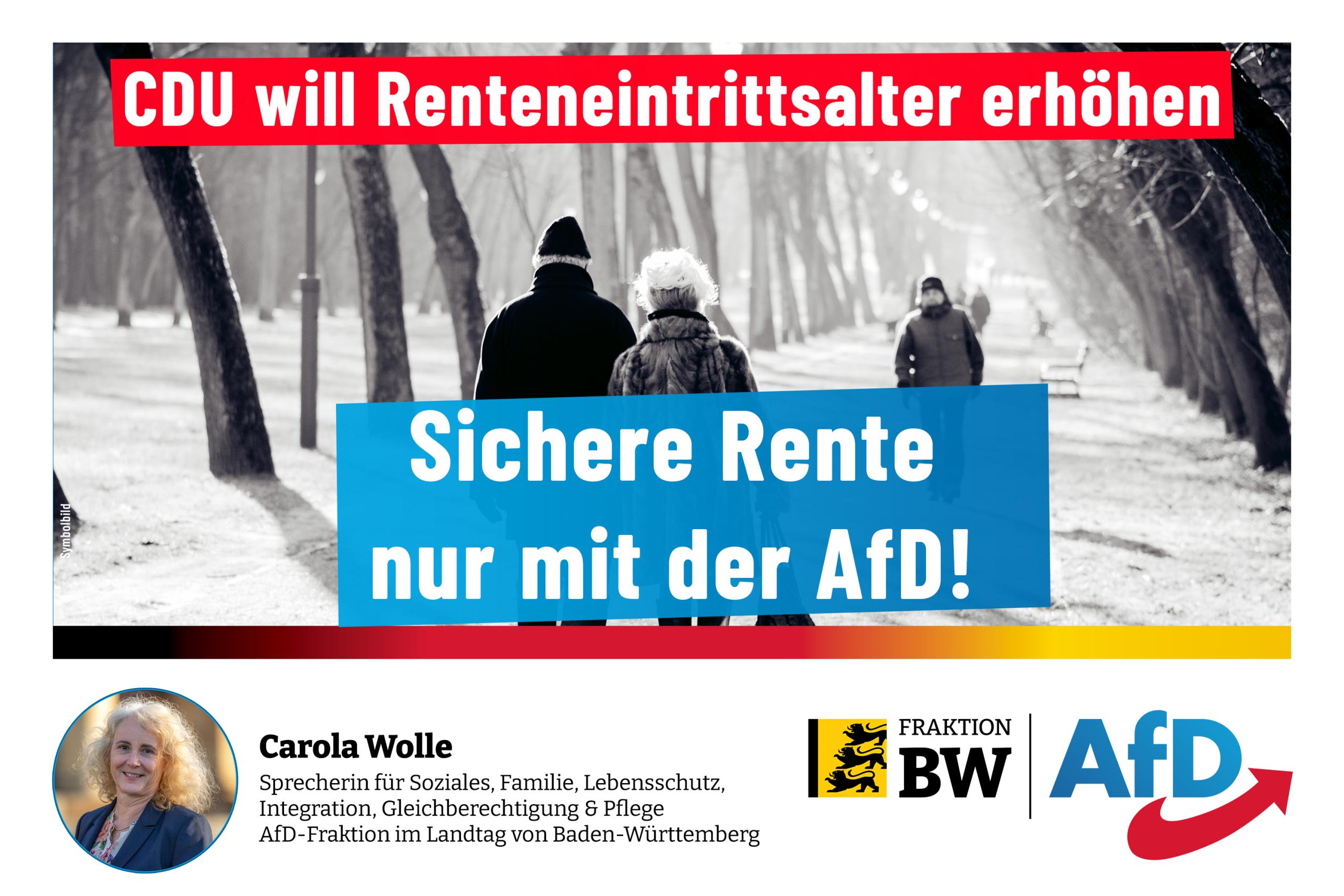 „Was heute Mack & Co. in Stuttgart losgetreten haben, muss Beschäftigten und Rentnern in Baden-Württemberg den Angstschweiß auf die Stirn treiben.“ Mit diesen Worten kommentiert die sozialpolitische AfD-Fraktionssprecherin Carola Wolle den CDU-Vorstoß für eine Bundesratsinitiative für ein höheres Rentenalter.