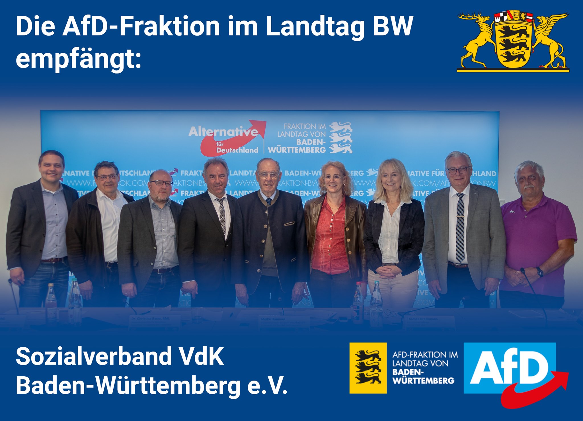 Das aktuelle Anliegen des Sozialverbandes VdK Baden-Württemberg e.V. nach Übernahme der Investitionskosten durch das Land und weitere sozialpolitische Fragen haben Landtagsabgeordnete der Fraktion der AfD im Landtag von Baden-Württemberg mit dem VdK-Landesverbandsvorsitzenden Roland Sing, dem VdK-Landesgeschäftsführer Hans-Josef Hotz und dem Referenten für Soziales, Stefan Pfeil, in einem regen Austausch im Fraktionssitzungssaal der AfD erörtert. Die AfD stimmt dabei in vollem Umfang der Ansicht des VdK zu, dass Pflegebedürftigkeit in Baden-Württemberg zunehmend zum Armutsrisiko wird. Wer heute pflegebedürftig ist und im Heim lebt, muss einen großen Anteil der Kosten selbst bezahlen. Daher befürchten viele Senioren zu Recht, dass im Fall eines Heimaufenthalts das hart erarbeitete Eigentum veräußert und ihr ganzes Vermögen für die Pflege aufgebraucht wird. Bei dem aktuell hohen Eigenanteil werden viele Heimbewohner im hohen Alter dadurch in die Sozialhilfe gedrängt. Der Sozialverband VdK Baden-Württemberg e.V. fordert deshalb, dass das Land pflegebedürftige Heimbewohner bei den Investitionskosten entlasten muss. Von beiden Seiten wurde die Forderung des VdK nach der Übernahme der Investitionskosten diskutiert.