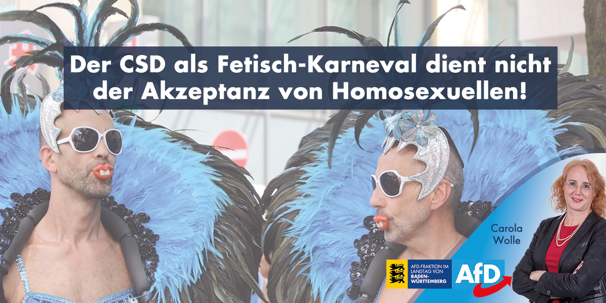 Zu dem am kommenden Samstag in Stuttgart stattfindenden „Christopher Street Day“ meint die AfD-Landtagsabgeordnete Carola Wolle: „In den 50 Jahren seit dem Stonewall-Aufstand haben sich die Homosexuellen gleiche Rechte und volle Akzeptanz in der Gesellschaft erkämpft und das ist gut so“. Aus diesem Anlass finden in diesen Tagen wieder überall in Deutschland der so genannte „Christopher Street Day“ statt. Betrachte man Bilder oder Videos dieser so genannten „Polit-Paraden“, so kämen jedoch Zweifel auf, ob es sich hierbei wirklich um politische Demonstrationen handele. „Schrillstes Outfit, Fetische, Sklaven und geschminkte Männer in Frauenkleidern deuten eher auf eine Art Karneval als auf eine politische Demonstration hin“, so Wolle.
